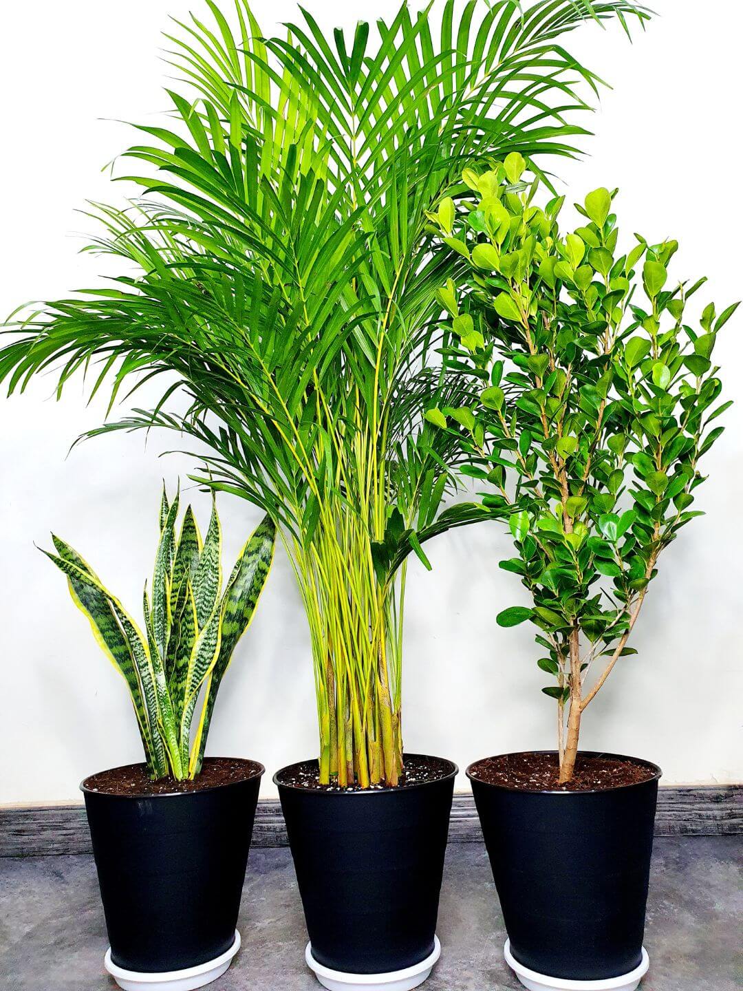 Potted Large Areca Palm, Snake Plant, Ficus Panda in Matching pots: