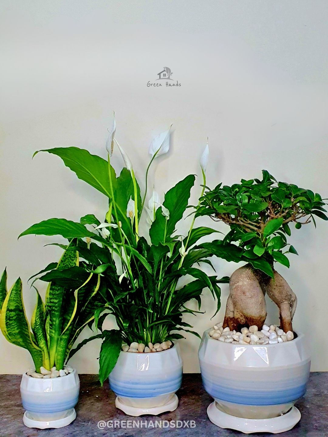 Premium Indoor Desktop Plant Bundle: Peace Lily, Bonsai & Snake Plant in Ceramic Pots: